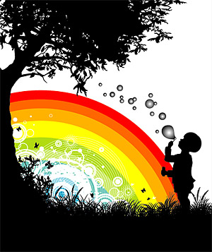 eps format, children blowing bubbles, trees, flowers and rainbow silhouettes vector material……