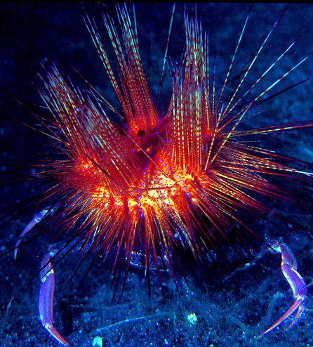 Blue crab holding an urchin on its head for protection.