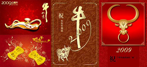 ai format, the author: Waltz, peter, etc., including jpg preview, keyword: Chinese New Year, New Year, an auspicious patterns, Ox 2009, Ruyi horns, the Year of the Ox will be the top end, gold bars, pattern, red, Chinese tradition, wishful, Chinese wind vector material